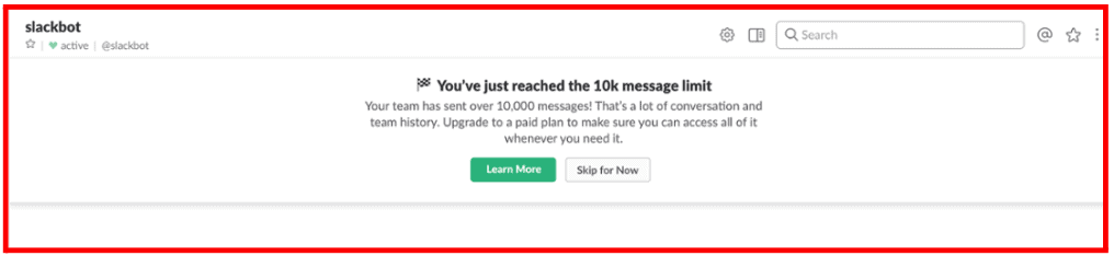 In the example here, Slack, a popular instant messaging and business communications platform, uses automation to send personalized recommendations to customers. It allows users to upgrade to a paid plan to send and receive more than 10,000 messages and access their conversation history anytime.