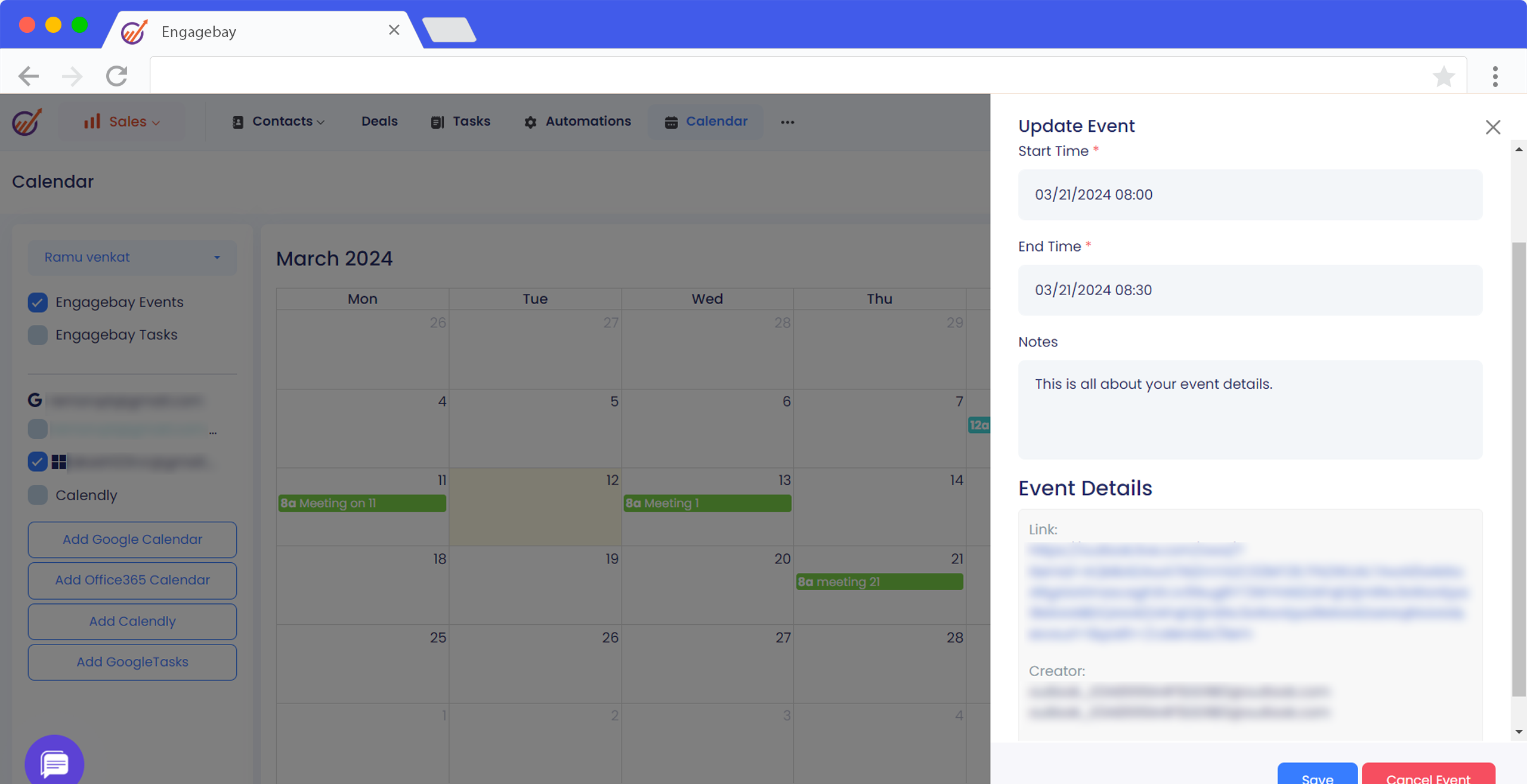 By integrating Office 365 Calendar Events with EngageBay CRM, workflow processes are consolidated, centralizing scheduling activities within the CRM platform. Events synchronized from Office 365 Calendar Events to EngageBay CRM (and vice versa) are readily accessible, allowing users to effortlessly view, edit, and manage appointments. This elimination of the need to toggle between various tools saves time and enhances productivity for sales and support personnel.